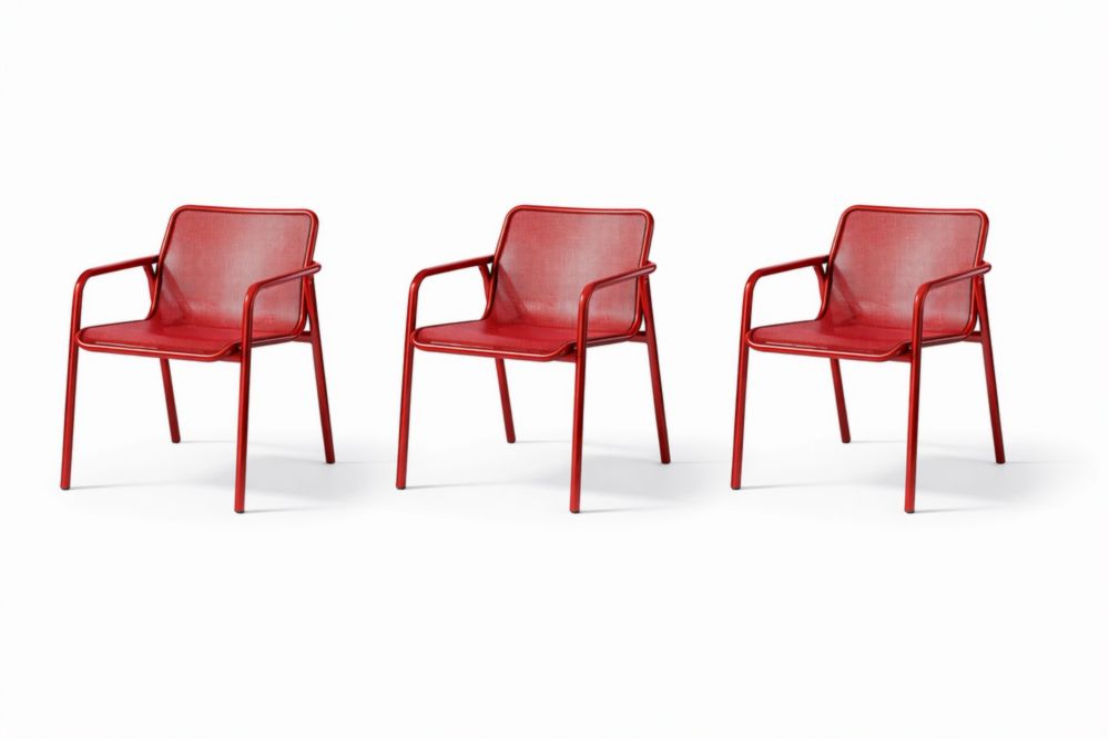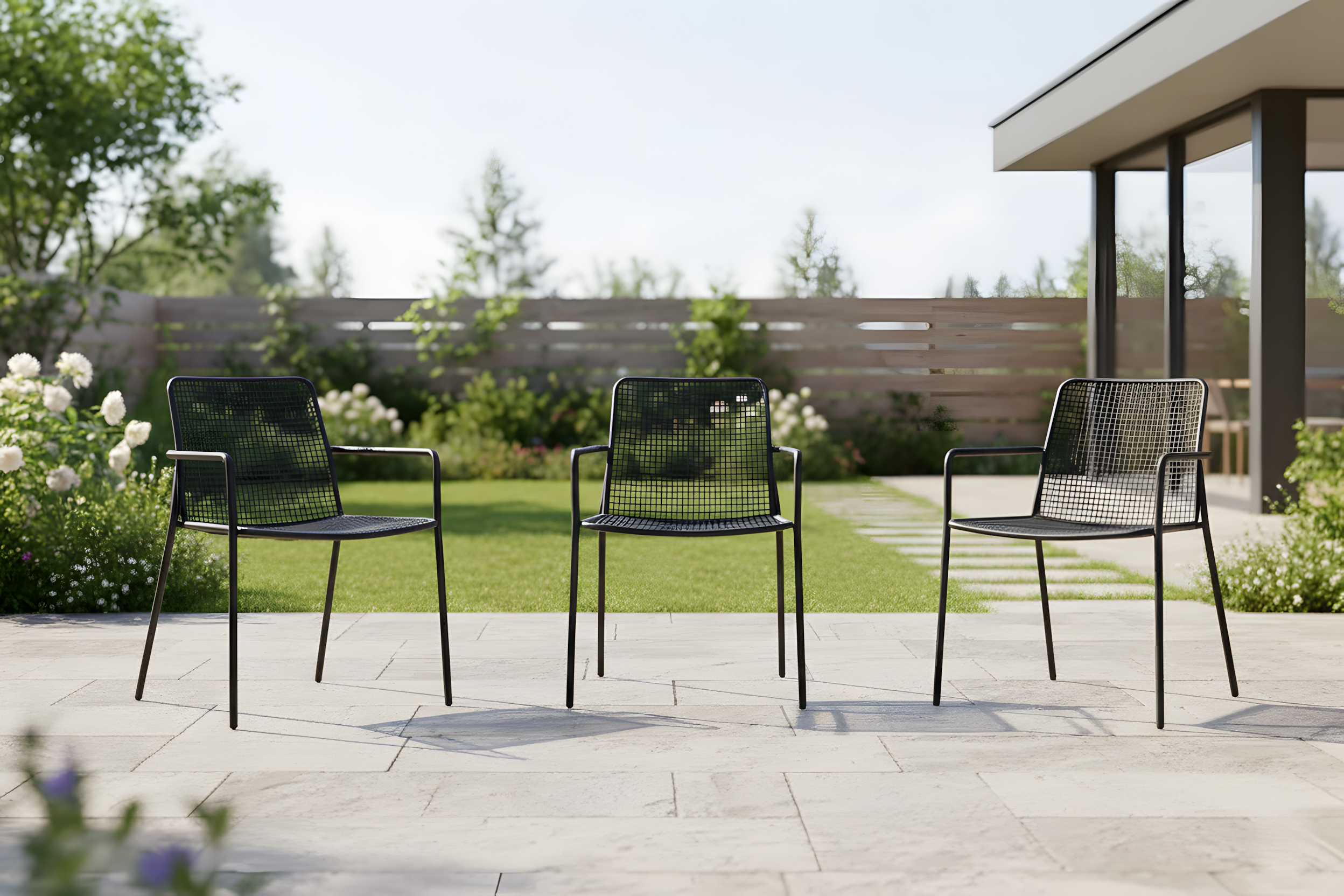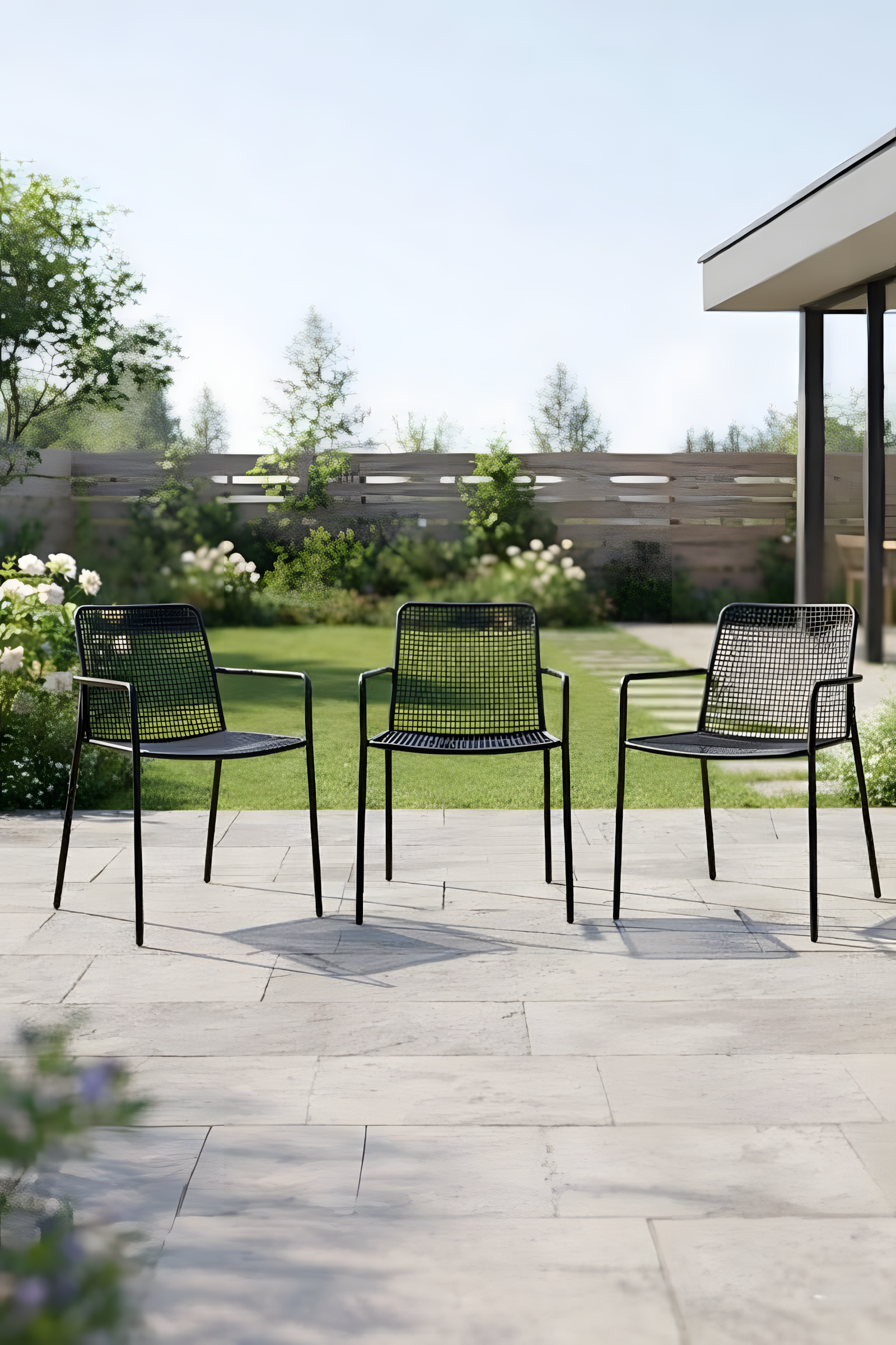 The set includes three lounge chairs featuring sturdy metal frames and polyester fabric cushions. Each chair measures 70 cm x 80 cm x 85 cm and weighs 12.00 kg. Designed for outdoor use, the cushions are easy to wipe clean. Assembly is required.